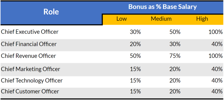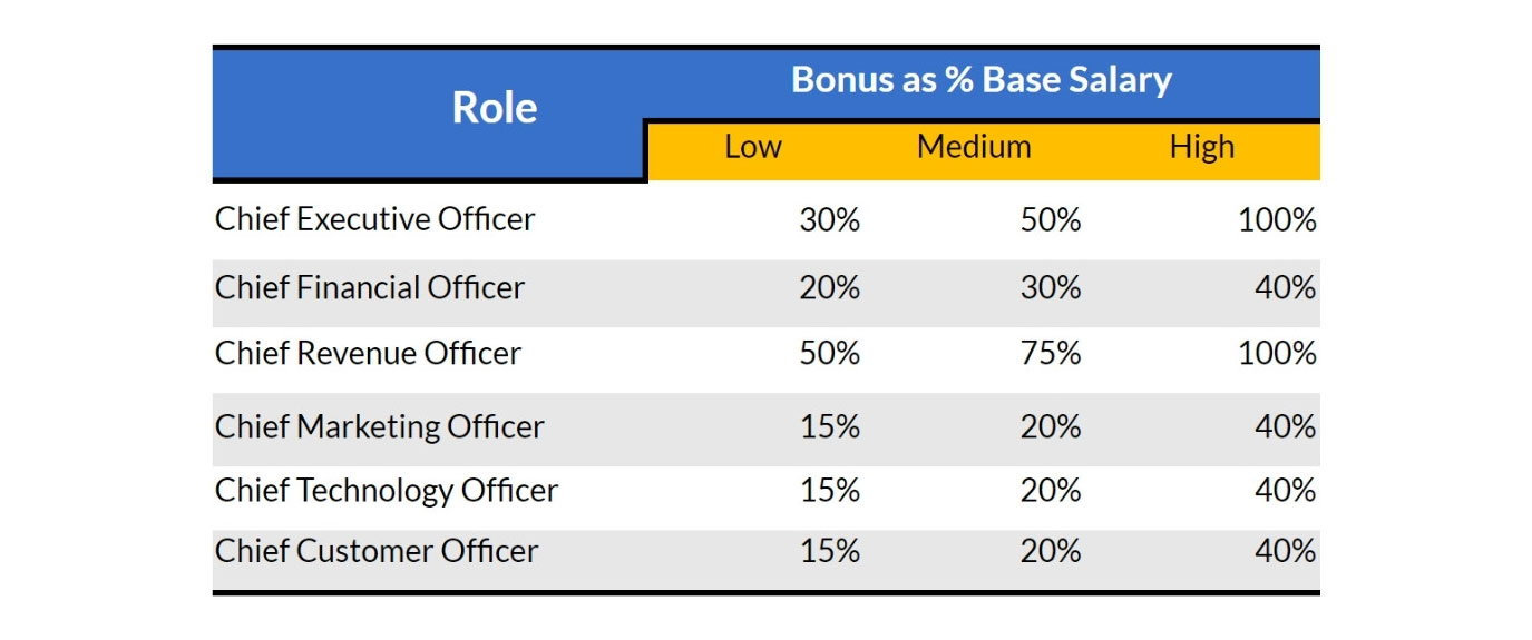 Once your team is working from the same playbook, build out a bonus structure (as a percentage of base salary) that incentivizes performance. See the bonus structure diagram below, noting that the low, medium, or high percentage reflects the depth of an executive’s experience.