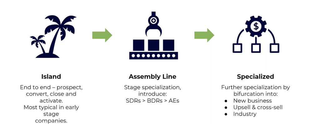 Again, the right sales model will change over time. In general, you’ll move along a path from the Island Model (where each Account Executive works independently), to the Assembly Line Model (where you’ve got different teams finding leads, closing deals, and nurturing accounts), to a highly specialized model (which includes teams focused on new business, cross-sell/upsell, etc.).