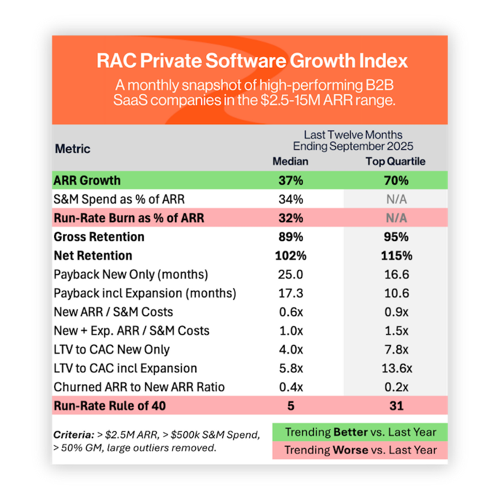 Every year, we have the privilege of meeting with hundreds of software companies, many of them in our ‘sweet spot’ of $2.5-15 million in annual revenue. From those conversations and screens, we’ve assembled the RAC Private Software Growth Index, a set of key performance indicators aggregated across the 400+ companies we’ve reviewed in detail.